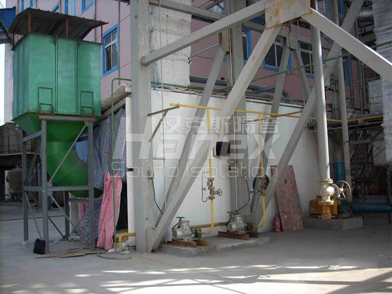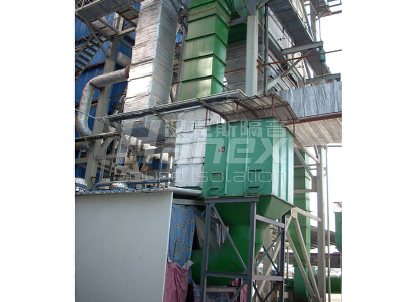 嘉興富林化纖有限公司75T/H循環(huán)流化床鍋爐配備一臺一次風(fēng)機,進(jìn)出風(fēng)口噪聲分別高達(dá)94.4dB(A)、100.1dB(A)。漢克斯隔音采用了在進(jìn)出風(fēng)口安裝消聲器并對其整體設(shè)置隔聲罩的方式進(jìn)行了治理,治理后在隔聲罩1米處量的噪聲值為80dB(A)(未排除其他設(shè)備噪聲)