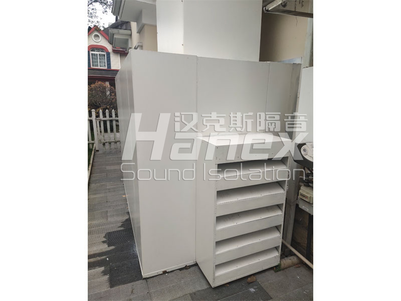 隔聲罩左方安裝設(shè)備檢修門,方便人員進出,右側(cè)安裝一臺通風消聲器,保證設(shè)備通風散熱的正常。頂部安裝一臺排風消聲器。隔聲罩背面靠墻處安裝吸聲層。